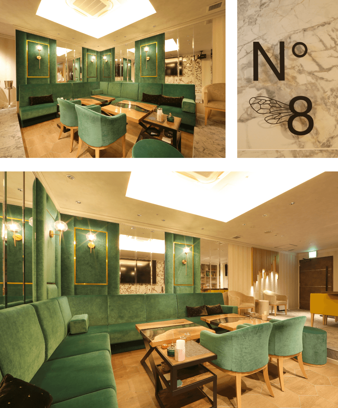 NO°8(Number Bee)は、1日1組限定でご案内する特別な空間。洗練された内装と贅沢な時間を、誰にも邪魔されることなくお過ごしいただけます。